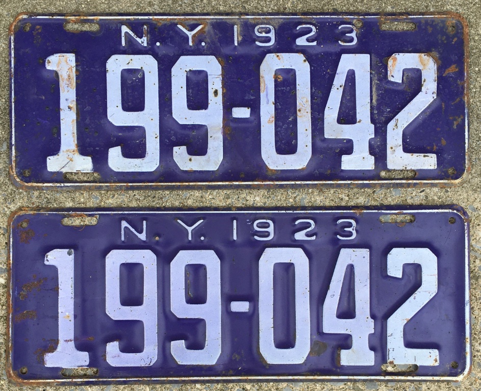 1923 NYS license plates. Matched pair of originals in excellent condition. Original paint. I haven’t tried cleaning these they are as found.