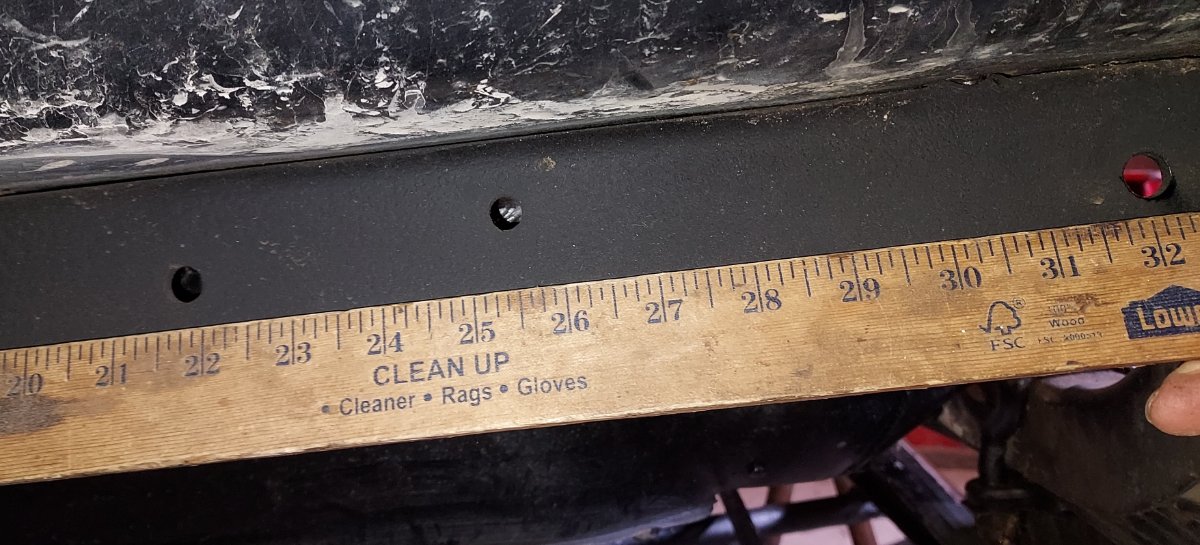 Attached are pictures of a 26-27 frame. The yard stick 36" mark approximates the front of the frame. The bumper brackets first tab hole will use the frame hole at aprox 34" and 32". The third bumper bracket hole in the frame is at aprox 22". Ignore the hole in the frame at 25.5", my car is Canadian and the frame has factory holes for left and right hand drive and that hole is for a RHD steering column lower bracket.