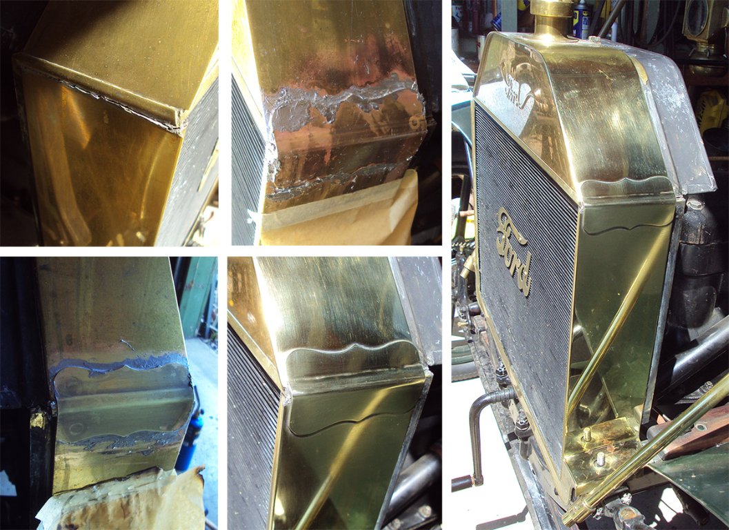 Today I made reinforcement patches for the corners of the radiator which have separated on many radiators. The separation has been there for half a dozen years with no problem, but it sometimes concerns me. I believe I sweated enough solder in there to hold it. If not, there will be more to do later. A lot of clean-up was required. I was careful not to loosen any of the existing seams.