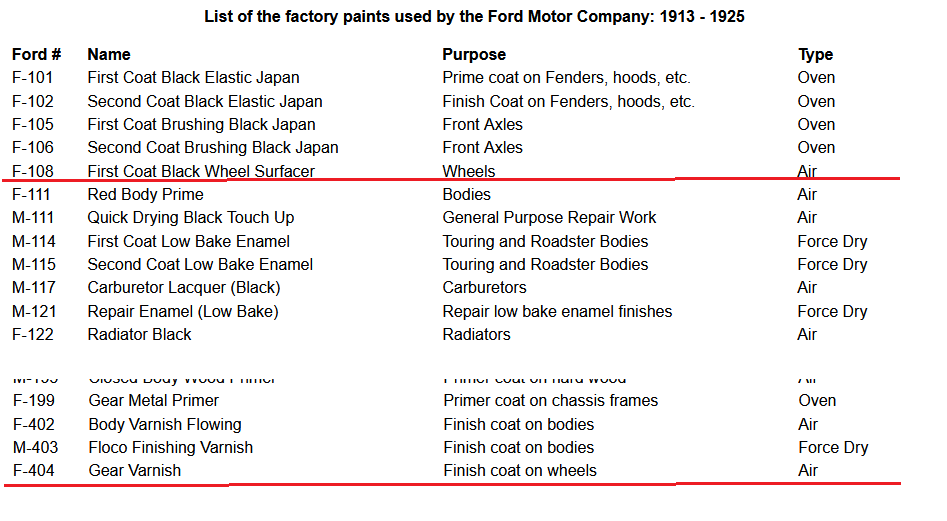 if you can find a concrete example or memory of someone scraping paint off a Ford wheel in the early days, I'd like to add it to my list. So far, all of the Ford wheels I've seen in early photos up to 1925 are painted. I think the only time varnished wheels would be on a Ford pre-1925 would be through five-lug accessory demountables.