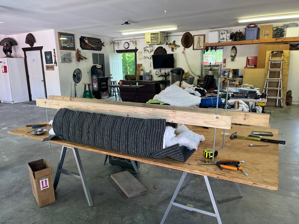 Today, we worked on installing the cushion onto the seat spring for my 1927 coupe. We used a compression table. Here are photos. We still have to finish the corners.