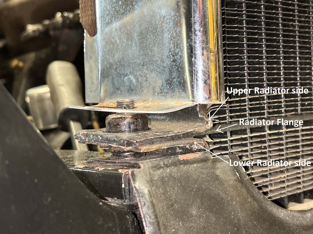 I would argue I do have this correct per the drawing, most radiators I have seen look like the mounting flange is a single thickness, on mine the top and bottom sides of the radiator are bent at right angles and soldered to the flange making the flange 3 thickness of metal, if that makes any sense at all, so to answer Frank's question "what is this" it's the lower side of the radiator.