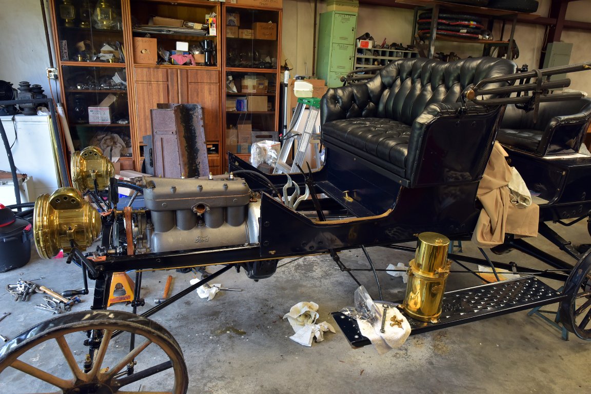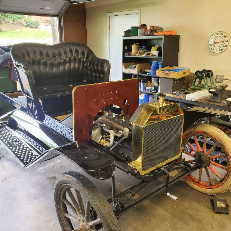 Preparing to pull the engine in my 1912 Comm Roadster to address magneto issues, make repairs to hogshead, and putting pan on a straightening table. I had hoped not to go to this length, but found it necessary. I hope my car turns out as nice as Richard's (who has been most gracious in answering my pestering questions). I have the headlights sitting on the forks while I clear a place to safely store them (man, my shop is cluttered up). Certainly, they will be out of the way when I go to lift the engine out. Fenders, splash aprons, and hood are at the paint shop. After I am done with the engine and it is back in the car I will finish my new Stutzman rebuilt wheels and get them ready to go to the painter.