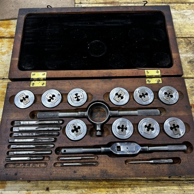 Just picked up this tap/die set...dates to pre 1912 and is a fractional set from 7/64 to 1/4 in 1/64 increments. Some real oddball stuff, and yet will see service in due time due to the kind of work I do. Was very pleased to get my mitts on it and for a very good price, too.