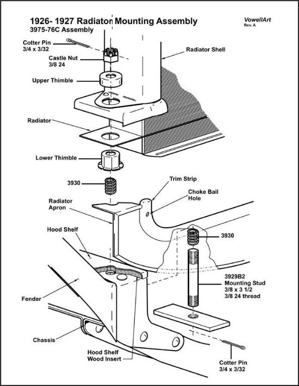 1927 Touring, I can not see a way to mount the radiator with the springs, without having the radiator mounted solid to the hood shelf. the picture shows where the mounting hardware would end up if the springs where fully collapsed, using new spring, which when collapsed are shorter than the originals.