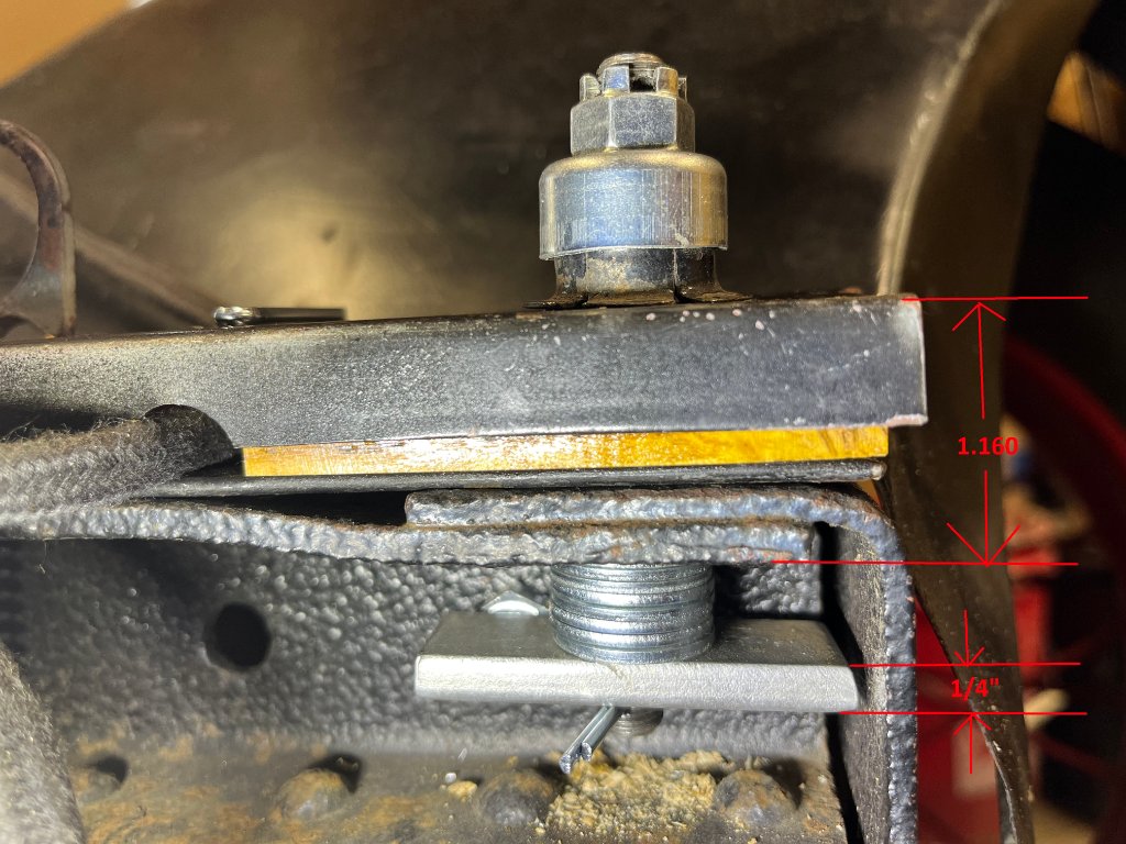 I sanded the wood shelf blocks down to 1/2" from 5/8" thick, I filed all the solder boogers off the flange, I can get the radiator mounted now but believe it is still to tight. Most pictures I can get a close enough view of, it looks like the flange is about 1/8" thick and sits about an 1/8" off the frame, my radiator flange is .300 thick and the flange sits on the frame with the nuts just tight enough to get the cotter pins in.