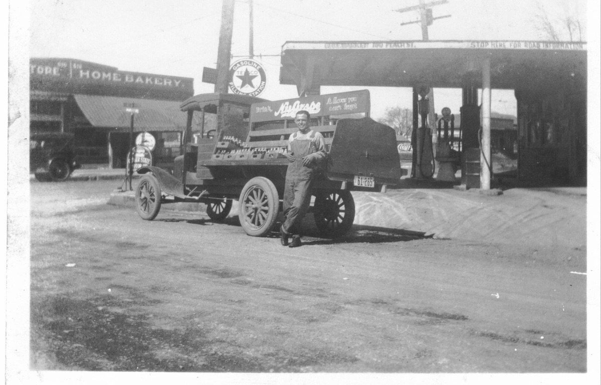 Here’s a neat photo of a Sodawater delivery TT Truck. Use to see NuGrape in this Central Texas area but that was in the 50’s -;60’s but not much after that. The angle of the shelves kept the bottles from bouncing around a falling off I would imagine.
