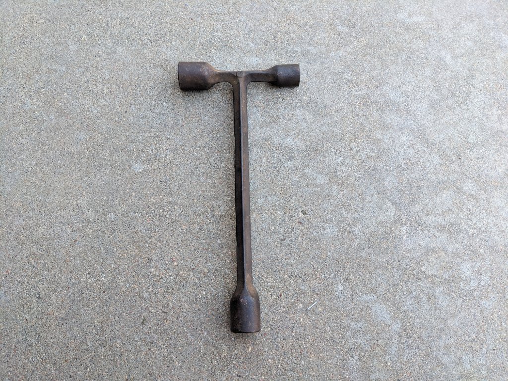 My wife and I are packing up to move to another house, and I stumbled onto this wrench that came with our 15 runabout when I got it a few years ago. It has a "M" on one side, which makes me think it could be a Mossberg tool, and "106" on the other. Two sockets in the horizontal section are a square 3/4" and 1/2" socket, with the one at the longer end being a regular socket.