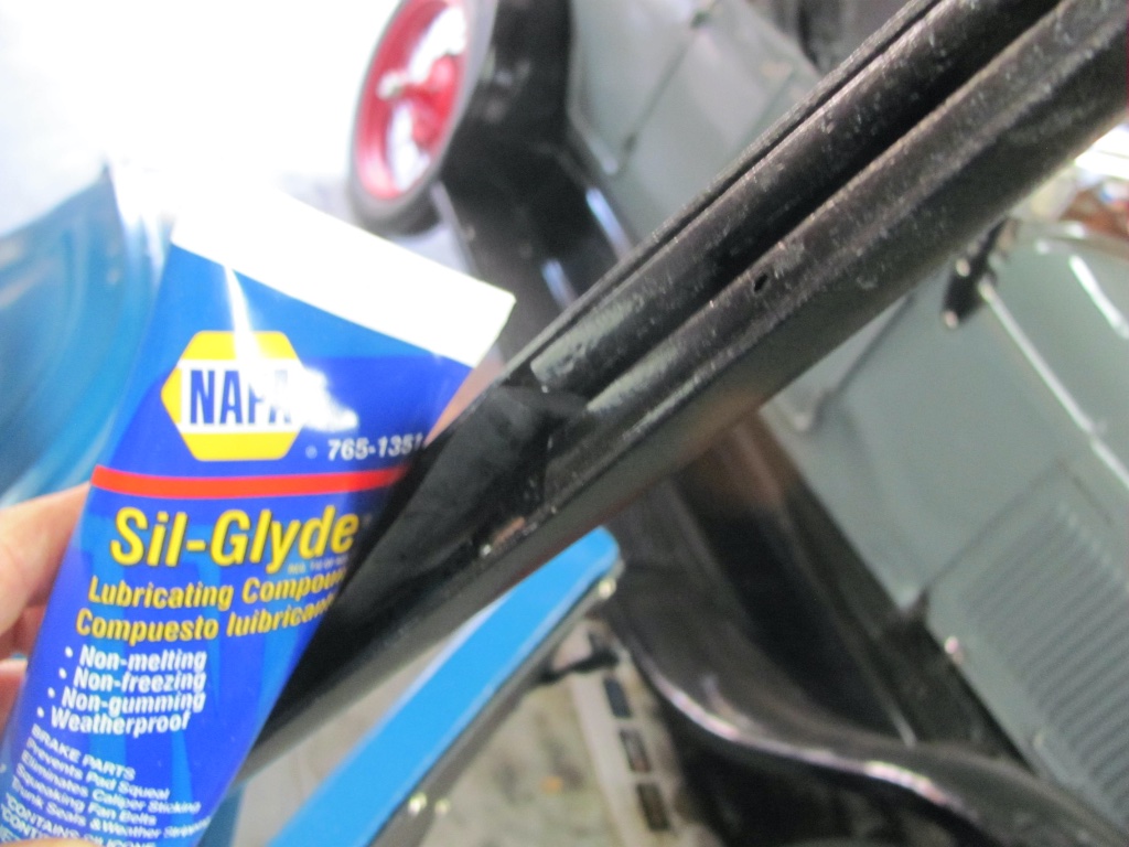 I used an aerosol spray graphite to lube the rubber seal and channel with great success. It leaves no film or mess.