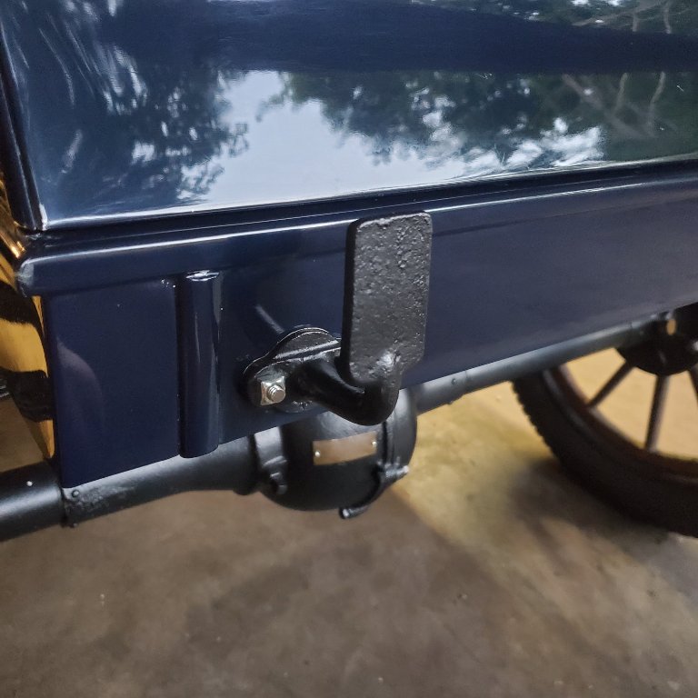 The rear shot is from a 1912 Commercial runabout that has been for sale on eBay. Close up shows holes where the taillamp bracket would be. Wood screws won't hold the hanging weight or the vibrations. Carriage bolt on the wood side, and square nuts out. The other photo is an original1911-12 touring, and shows the mounting hardware.
