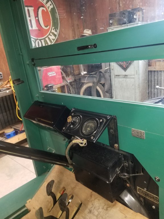 I picked up this tractor tool box at the steam and gas show last year. It was marked $10. I carried it over and he said he would not take less than $10 before I had a chance to speak. No rust and really straight ,I was happy. Only when I got home did I realize it was on the same angle as my ammeter mount. " Better to be lucky than good." Finally installed it.