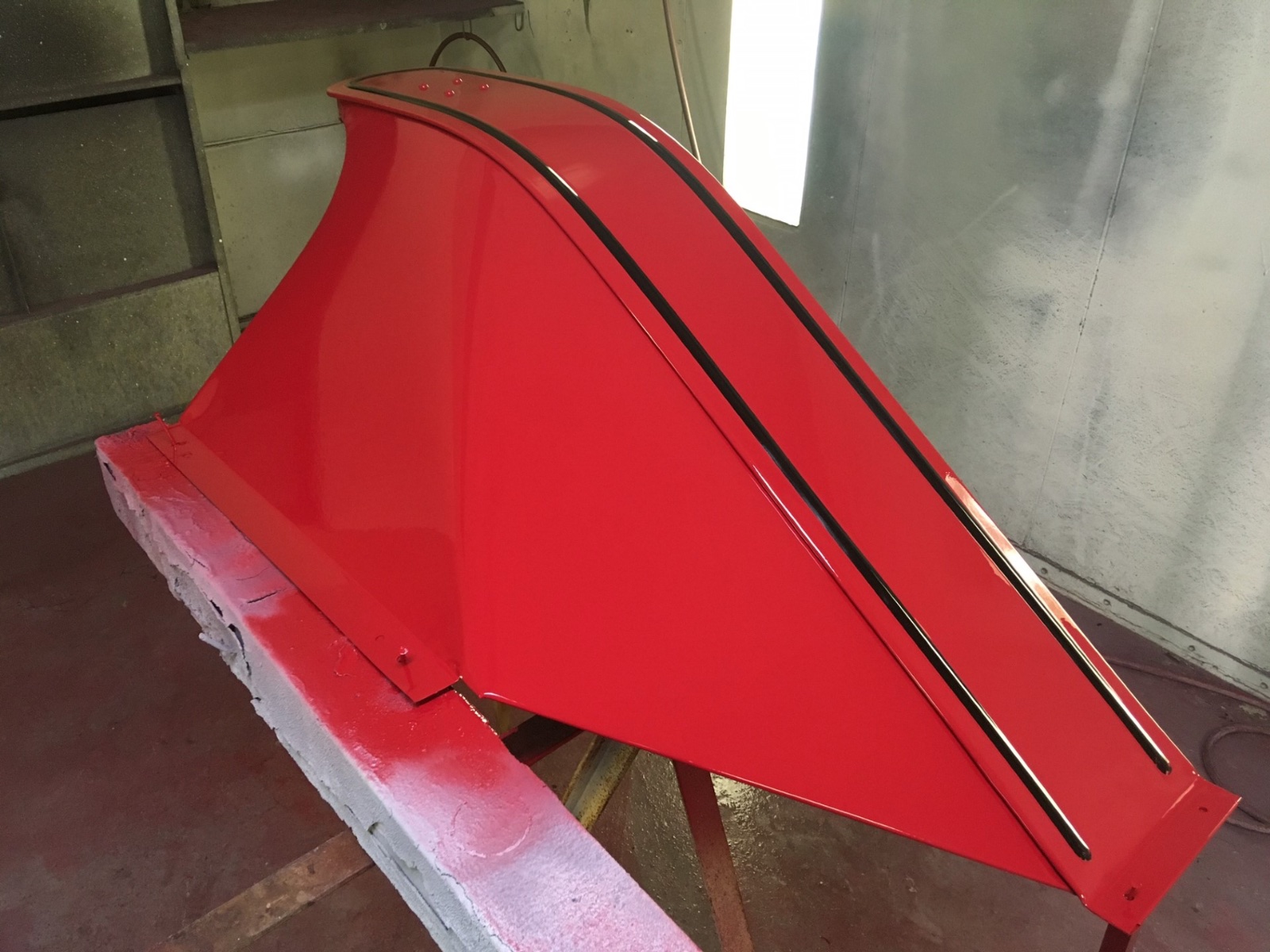 After a break to spend our 10th anniversary together with my bride, I’m trying to get back on this project and get the paint work done and get it assembled. Shot front fenders this morning. I had already painted the tops black and taped off the beads and had painted the bottoms red and masked them off. So set them up and painted the tops red. Then while the paint is still wet I pull the tape so the edges lay down and you get a nice transition. You DONT want to drop the tape in the paint. These should be dry enough to move out this afternoon and I can move in the rears and get them shot.I think everything red then has color on it. It took almost 3 of the 4 gallons of color to paint the car.
