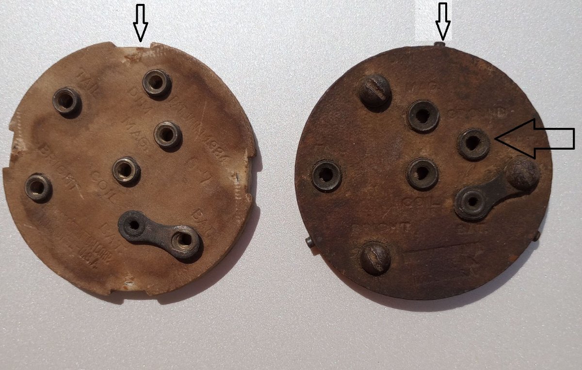 I have a Question: I am working on restoring my switch plate for my 1924 Touring, the back side terminal cover is this one on the left, it uses tabs that are folded back onto the piece to hold it together. It also has 6 terminations.