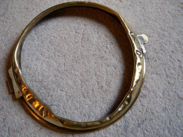 I had a disaster befall me at a car show a couple of years ago. I had my Neverout #80's headlites on my CDO replica, mounted on steel cowl brackets. Anyway while driving back ( 15mph) to load up in my trailer my left headlite bracket broke off and the Neverout landed on the road and I ran over it. It bent the lamp body, the 6'' convex lens was smashed, and the hinged headlight ring was mashed badly. I looked for replacement parts for a while, absolutely nothing for this large pair of very early lamps was available. Out pf desperation I decided to anneal the ring very carefully to soften the brass, using 3 types of body hammers to peck out the ring. After a weeks straitening and many test fits of the replacement glass lens and fitting of the ring to the lamp I sanded the brass smooth, starting with #400 grit wet or dry sandpaper and moving up to #1200 grit. Once all the lumps and gogs were smooth I finished up by polishing the door ring with Blue Magic brass polish. This took a couple of nights in front of the TV, rags in hand polishing away. I think it turned out well. Never toss a lamp part away, it may be able to be salvaged.