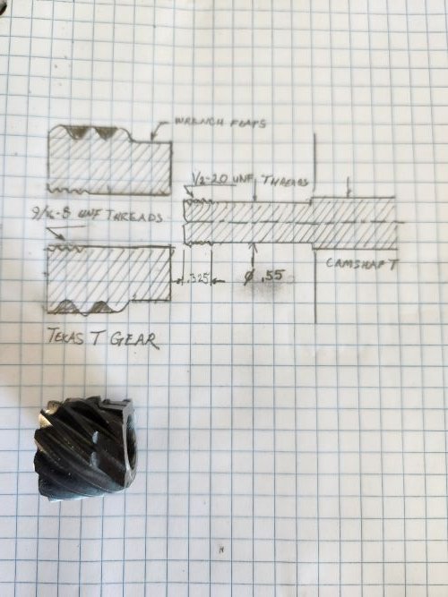Today, Bill Devine, from Texas T was kind enough to reply to my call for help on the cam gear. Surprisingly they machine the helical cam gears themselves and then send them out to be hardened. He said in all his years he's never heard of a camshaft with a 1/2-20 thread. He helped me a good deal with possible solutions to this... Like all problems that have multiple solutions, the task is to choose the safest, simplest, cheapest, and quickest one -