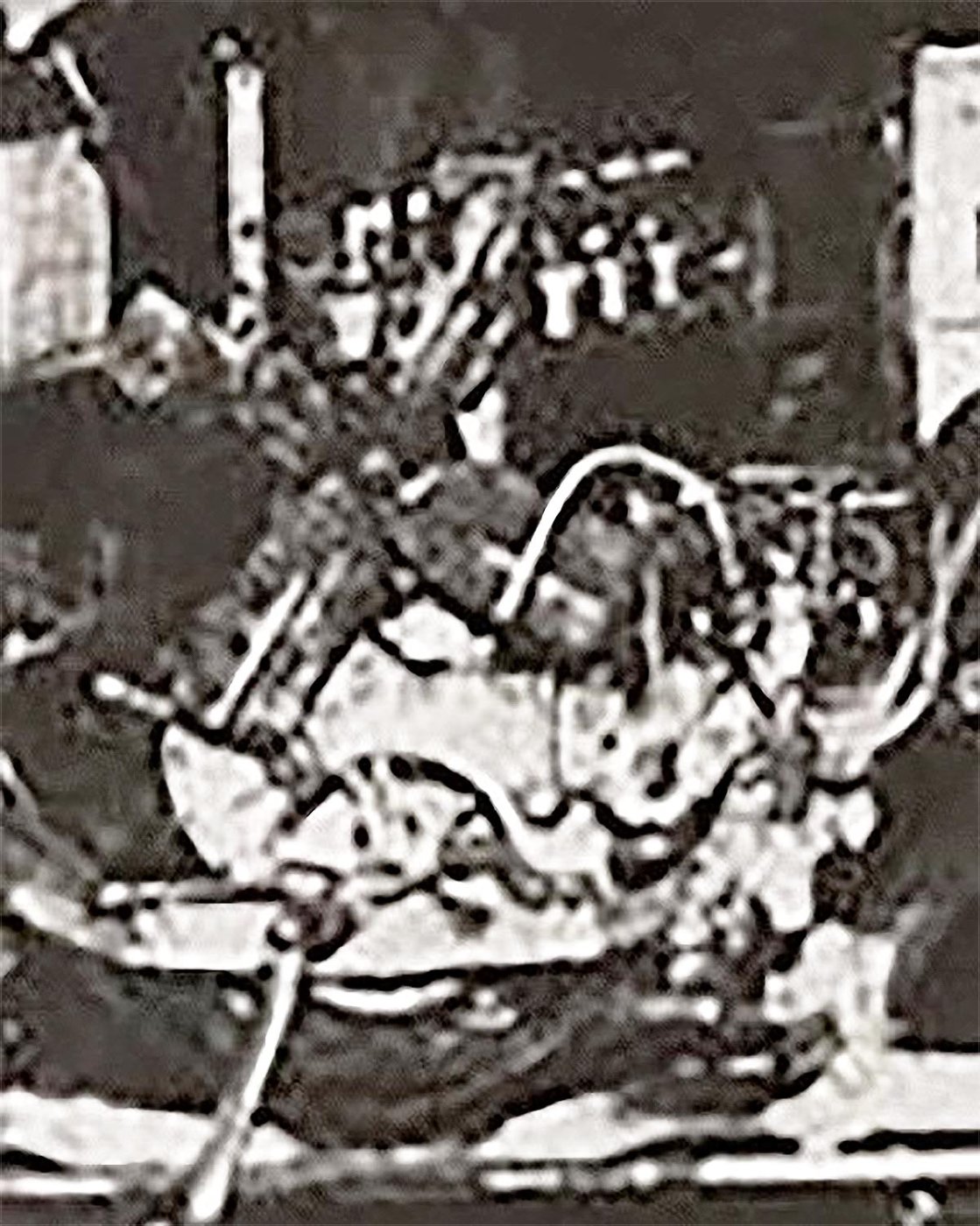 The other car with what might be overhead valves, in front tie rod, and fellows posed for the photo is intriguing to me. Lamp forks, a stray wire or linkage and a similar to Ford fan show an early teens presence. Boxes and shelves with parts and tools complete the vintage scene nicely. I ruled out Buick but can’t think what else it might be without a search. If only I could put those thoughts into melodic phrasing.