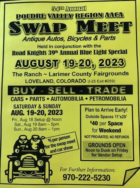 the 54th. annual Poudre Valley Region AACA swapmeet will be held on August 19th and 20th at the Larimer County Fairgrounds between Loveland and Fort Collins, Colorado ... this is along I-25 approx. 70 miles north of Denver and 40 miles south of Cheyenne, Wyoming ... this is an all make and model swapmeet with items ranging from early 1900's thru current models ... there is a good turn out of the regional model T and model A Ford owners ... i will have my babbitt bearing tooling and re-babbitted ball caps and connecting rods and some period distributors and carbs. for sale ... add this to your vacation schedule and enjoy our mountains ( 40 mile to Rocky Mountain National Park ) ... hope to see you here ...Gene French 970-581-2808