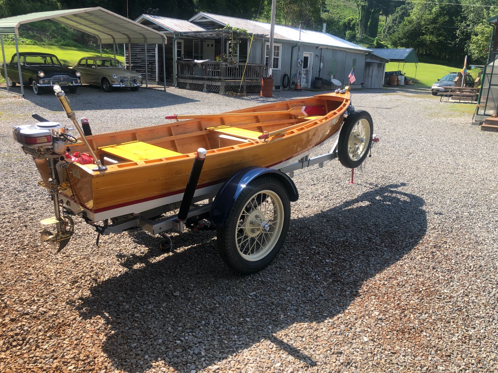 If you had Rockies you'd be okay. I'd do it. Biggest thing is, with small trailers they have a mind of their own and can be super cantankerous backing them down. That sure is a dandy looking boat. Almost too nice to put it in water and get it all spotted up! But, being wood, if the planks are not tightly caulked at their overlap joints she's gonna need to be in water in order to swell the wood enough to keep her from leaking like a sieve. Lyman never caulked there's so dad always "soaked" his for a couple of days prior to launch and it was okay. Boy did it "cry" out those seams the first day! I had a ChrisCraft but her seams were all caulked and even though I did soak her prior to launch, she barely left a drop out of her. Then I had the joy of pumping and drying out her bilge! Joys of boating. Glad I'm done with that. The T's are a lot less trouble frankly.