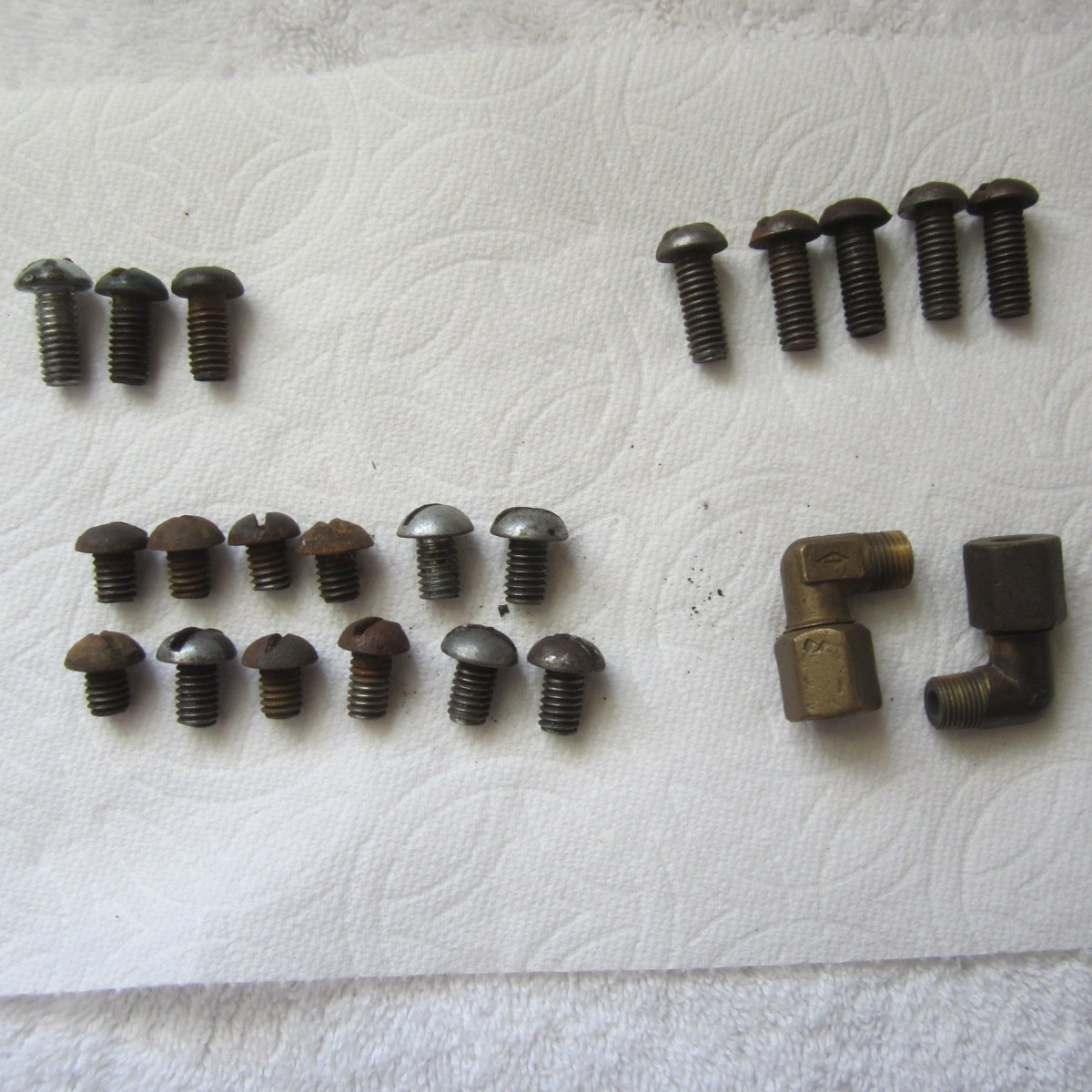 Old used screws for a Model T starter motor and transmission cover door- 20 in all. Plus 2 carburetor elbows with nuts for fuel line. $10 plus shipping. Phone calls preferred. 510-304-9667