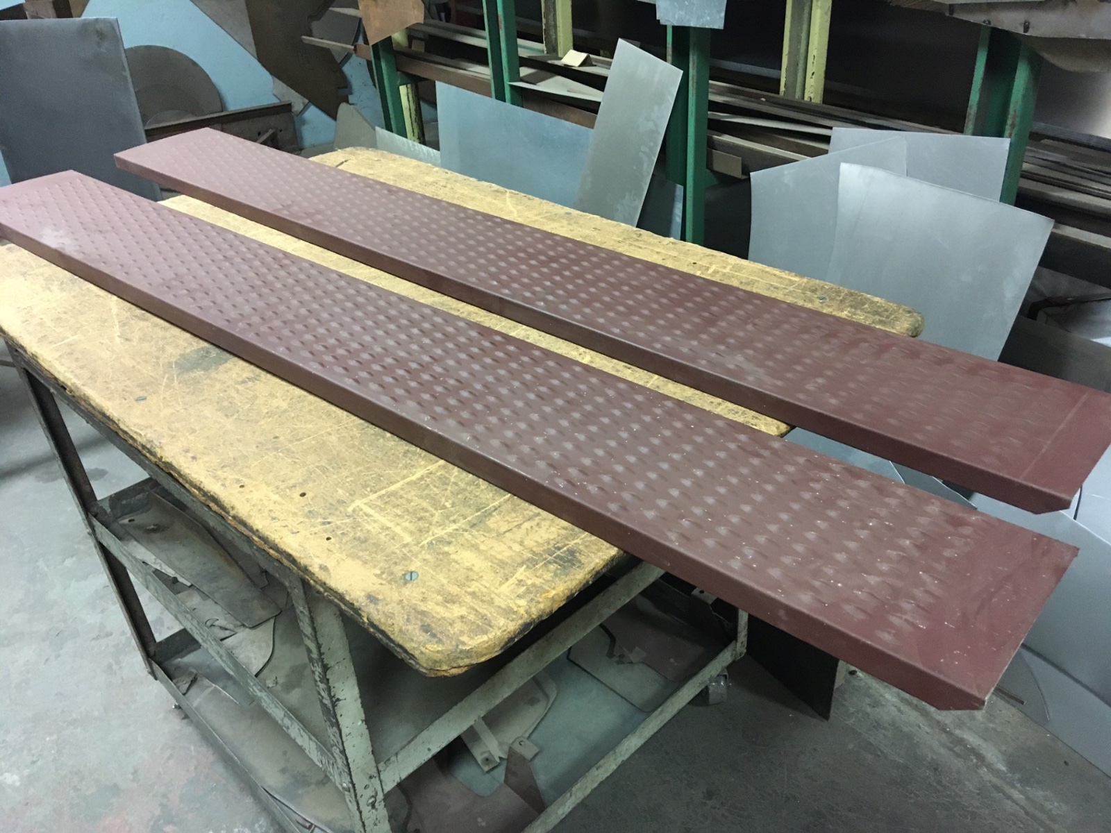 We are cleaning out after 50 yrs and we found these. They are 8 1/8”wide. 1 1/8” side wall and 69” long. Taper cut at front end. 16ga. $395 pr. Only one pr.