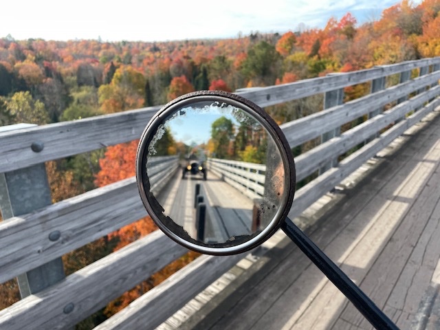 The fall colors are shaping up to be spectacular in just over a week now. I ran most of the route today to check conditions and plot the route. All maintenance on the stretch of the BILL NICHOL’S TRAIL that we are using is complete and the grade in great condition. Those booking rooms have a couple options…..the Parkview Lodge and Krupps Resort. Those wanting to camp have the Twin Lakes State Park across the street from the Lodge. I would really appreciate a note here on the forum of those who plan to attend ASAP so I can give restaurants a rough headcount as courtesy. I hope to be able to make map copy's to hand out Monday morning. We will meet at Parkview Lodge Monday morning(Oct. 2nd) as early as possible and plan to head out at 10am. I will give a short address before we start the tour. The section of the BILL NICHOLS’S Trail that we are using is just over 10 miles of graded railroad grade that is a multi-use state trail. It is my understanding that REGISTERED/LICENSED vehicles DO NOT need a trail pass. I will post the planned route as soon as I can figure out how to trace it on Google Maps. Attached is a photo take today from one of the three train trestles that we be crossing over. The view is breathtaking!