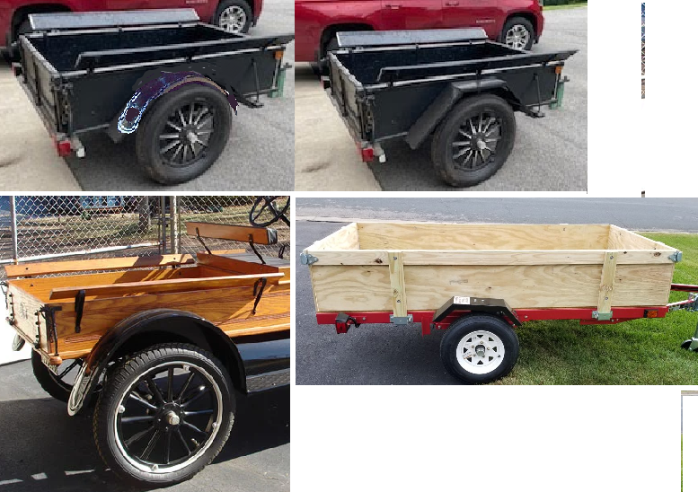 This afternoon I met a person who lives nearby me and he has this trailer from his grandfather. He told me that the family used to have a farm just outside of town and his grandfather would use this to cart produce to the town's farmer's market. He believes it was a kit at the time, maybe from Sears?, where you have to provide your own axle. It has a T rear axle underneath. It seems to be in nice shape. It has modern 12v lights on it.
