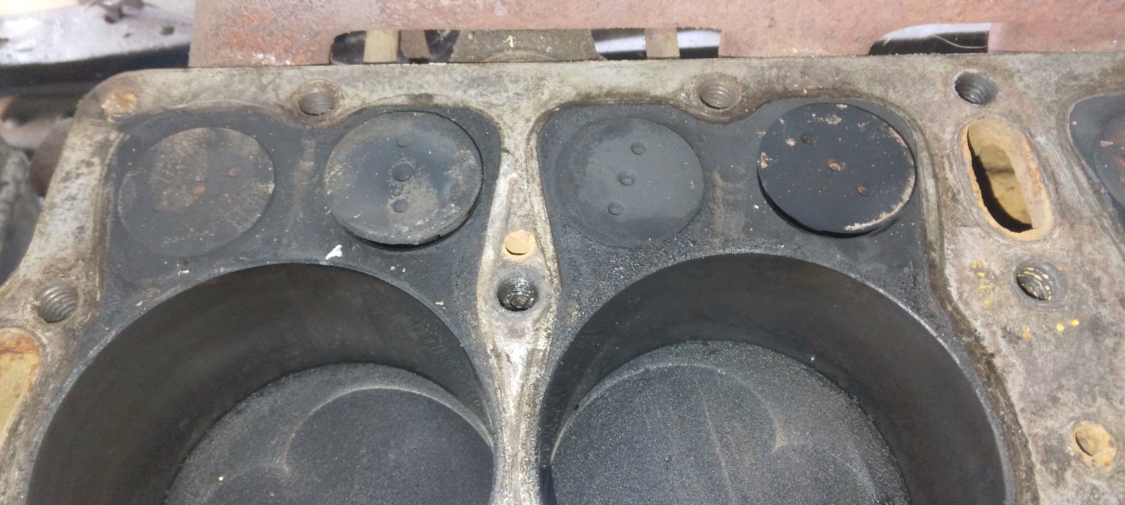 I see a fairly untouched original motor with worn seats, 2 piece valves & iron pistons.