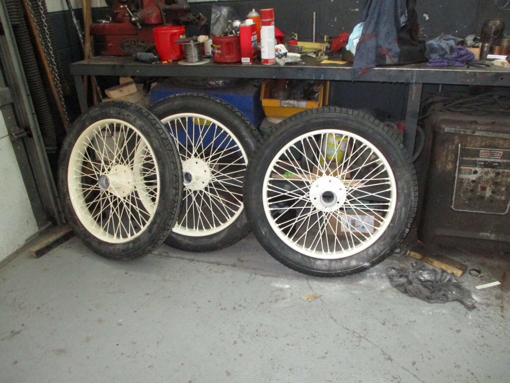 I've noticed one wood wheel on the right front at a couple of different events. The wire wheels were 32x4, and the wood standard 30x3 1/2, so maybe they kept the wood wheel on for the speedometer?