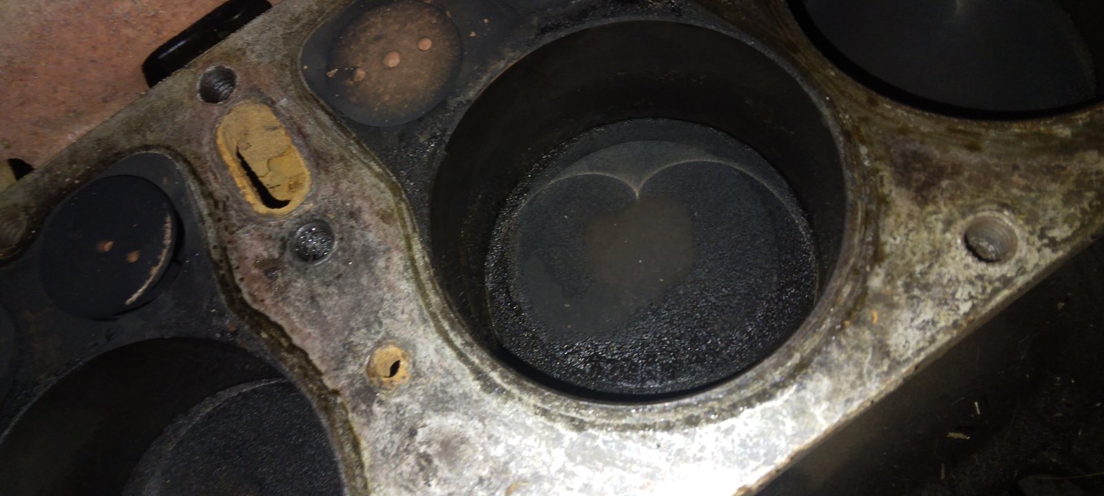I see a fairly untouched original motor with worn seats, 2 piece valves & iron pistons.
