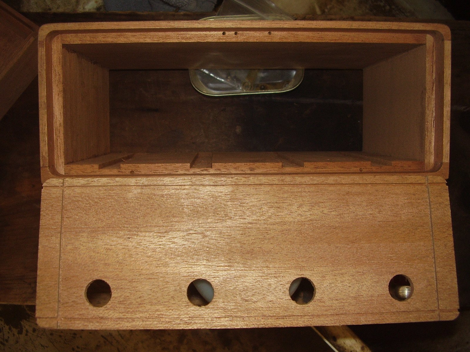 The '11-'12 style Kingston box bottom is a two piece affair, unlike the earlier '09-mid-'10 box that had a one piece bottom. The two piece is much easier to wire. The panel through which the springs protrude has grooves to hold the wire. The BAT connection is on the passenger side. Its wire is soldered to the terminal bolt and is then threaded through the terminal bolt panel and out through a small hole just above the bottom panel. It then runs through the wire grooves to the switch panel, then up through a hole drilled through the length of the panel to the hole behind the switch where it exits the wood and then is attached to the switch contact on the BAT side with a small terminal screw. The MAG wire does the same in all respects, just on the other side of the box and switch.