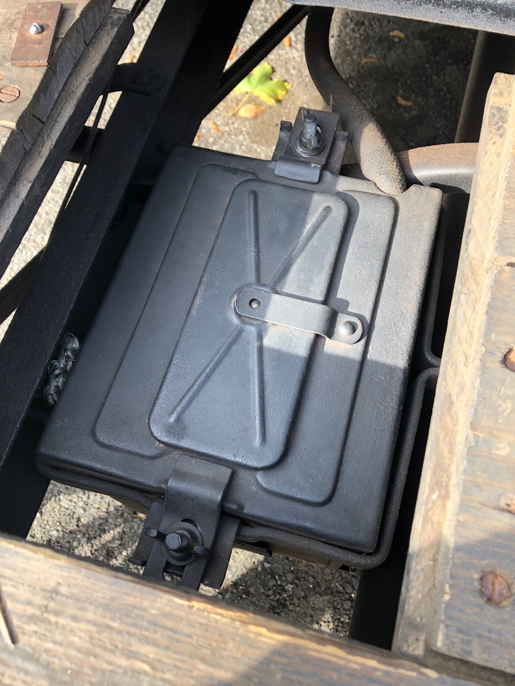 For the 6 volt Optima battery , I used two battery boards underneath to support and lift battery in the carrier, 2/0 battery cables ( picture shows old braided negative) , split sections of gas hose , covered battery holding frame, to protect positive cable from grounding out, and got cast metal battery hold down from e-bay to fit and more importantly be retained by original Ford battery clamps. Later modifications to hold down were made to have hold down straight between front and rear clamps, and negative cable was replaced with a 2/0 negative cable.