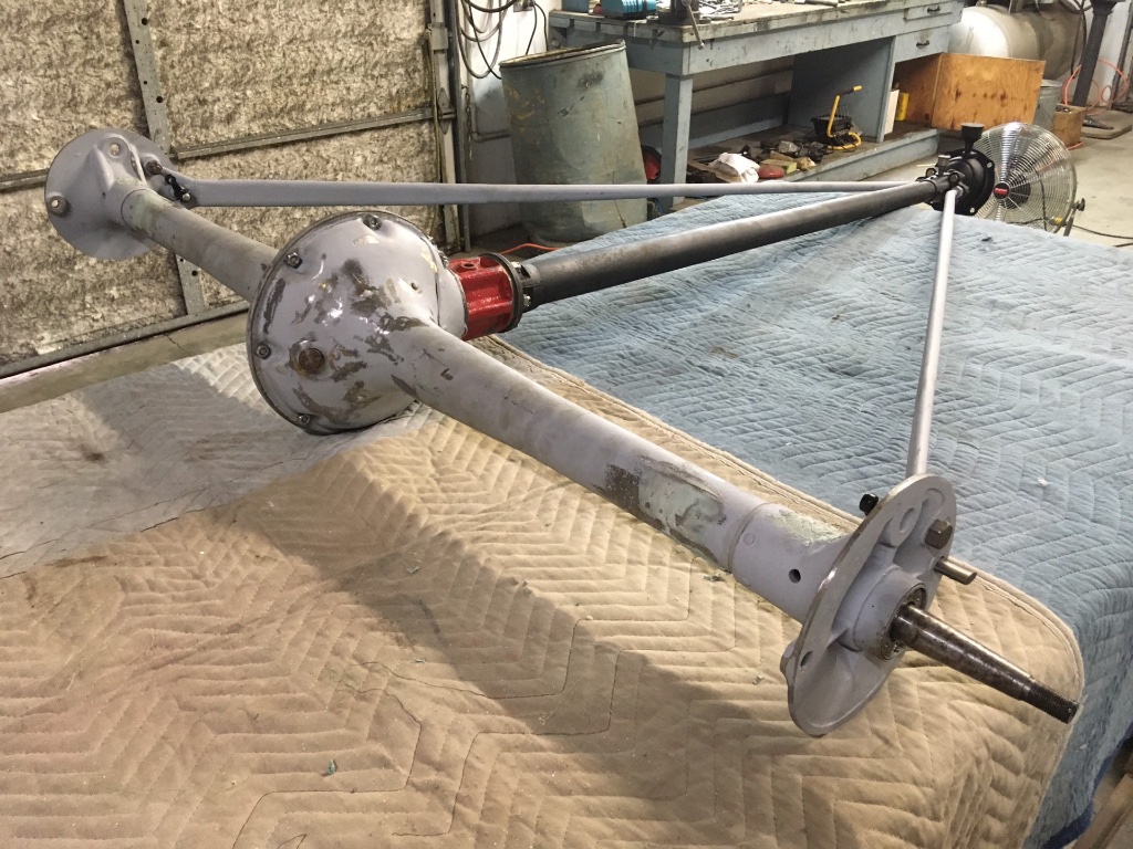 So today I separated the half’s and dressed down both sides of both bronze thrust washers. It was way to tight when I first set it up, so I knew it needed a fair amount taken off. I do that on a large disk sander holding the washer and rotating about 30% of the face on the sander with my finger tips applying pressure on the washer. The washer gets hot on your finger tips so I lay it on a cold piece of steel and work on the other one till I think they are done. Then I put new brake cams in the halves while they were apart. Cut some pins from a piece I found in scrap, dressed them and peened them. Went to reassemble the axle and noticed I had the guts in backwards. I put the wrong half in the vice and following my usual assembly habits I noticed the other half slid over the first half and not into it. I stood back and sure enough , ring gear on the wrong side. So after doing it right I bolted them together and had just the right drag pushing the ring gear with my thumb. Driveshaft was too tight also, so I knocked the pin out and took a few licks off the U joint. Reassemble and install into axle and now everything rotates smoothly with just the right amount of drag. Tomorrow I’ll work on filling some dents and scares and get it ready for paint.