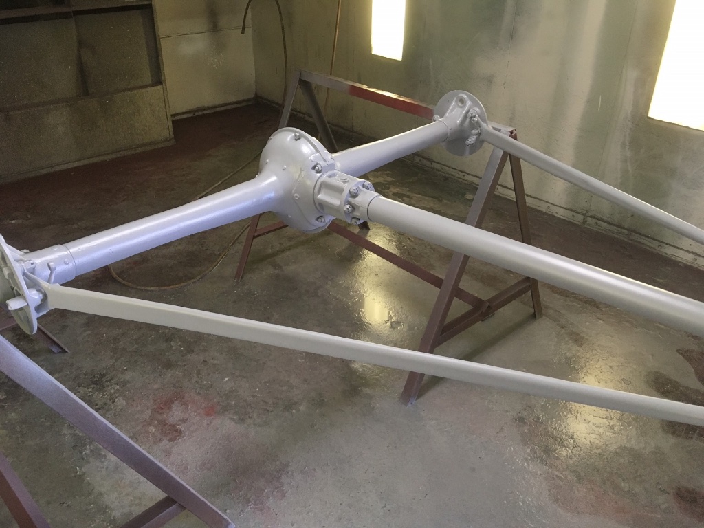 Larry, the shackles are in correctly. First round of paint on rear axle. Nothing is easy. Had to replace all the ceiling lights but one in the booth. Guess I didn’t clean the gun good enough when I left last year. The tip and the fan were frozen to the bottom of the bucket in some kind of amber substance that was hard as nails. After breaking them loose I drilled the air passages with tiny bits and then let sit overnight in paint stripper. Got it to work, got it shot, got a few runs. Now , tomorrow l will sand it out and try being a little more cautious with the second round .