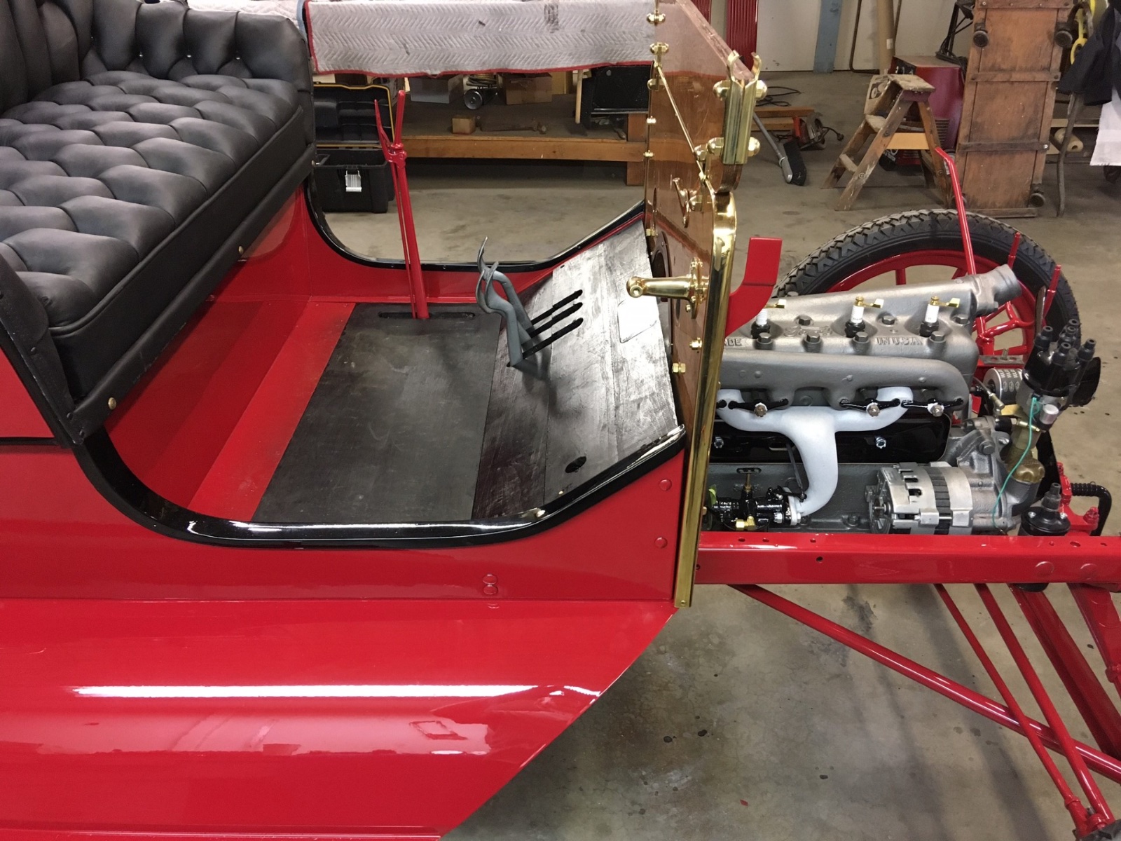 Is the body an original or new one? A 1910 wood covering or a 1911 metal over wood. The door pannels give the impression it may be a 1910 style. It does have a one peice spindle front axle and what seems to be a 1911 or 1911-12 rear end.. 1911 running boars are available reproduced. I see it will be tour vihicle. A great job on what will be good looking car.