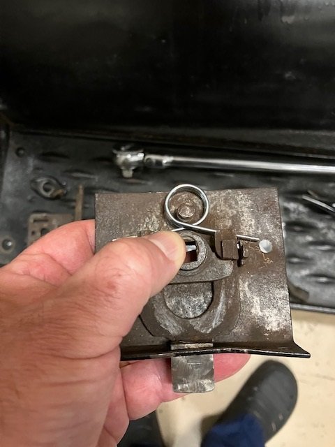 Hello all, my 1922 touring rear door latch recoil spring broke. Now the latch will not recoil so it does not work. This is I think a period but non-Ford 3rd party latch because it has a handle on both sides. Unfortunately, the post that holds the spring is peened onto the latch. Any suggestions for salvaging this? The two other latches are the same as this one so it was probably changed at some time in the cars history. I can make out ...Mersick co, Newhaven, Conn. It is probably The English & Mersick Co. New Haven, Conn? No patent number that I can see. So far, I cannot find a similar example anywhere online. They did make carriage latches and have latch patents. I would be obliged if anyone could help me to salvage this lock. You can see the loose broken spring in the picture of the mechanism as it looks removed from the door. Other than the spring the latch is in good used condition.
