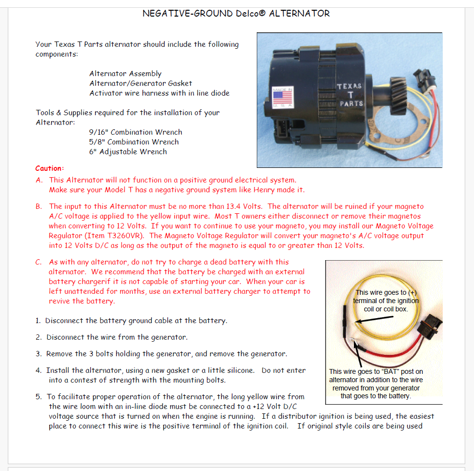 Well I'm not familiar with this Texas T thing but I do know the one I got from Snyders only uses the one yellow wire connected to it's top post much like a generator. It took all of 5 minutes, 10 tops to get rid of the defunct generator and put the alternator on. So glad I made the choice.