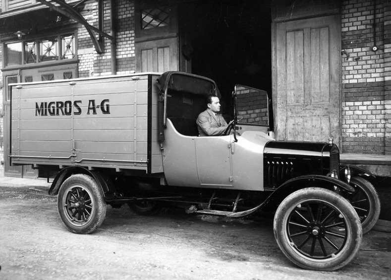 In August 1925, Gottlieb Duttweiler sent the first five Migros AG sales vehicles onto the streets of Zurich. They initially only sold six products: coffee, soap, rice, coconut oil, sugar and pasta. The packaging was larger and the prices were 10 to 30 percent lower than the competition. Thanks to the Ford TT, he was spared the costs of sales outlets.