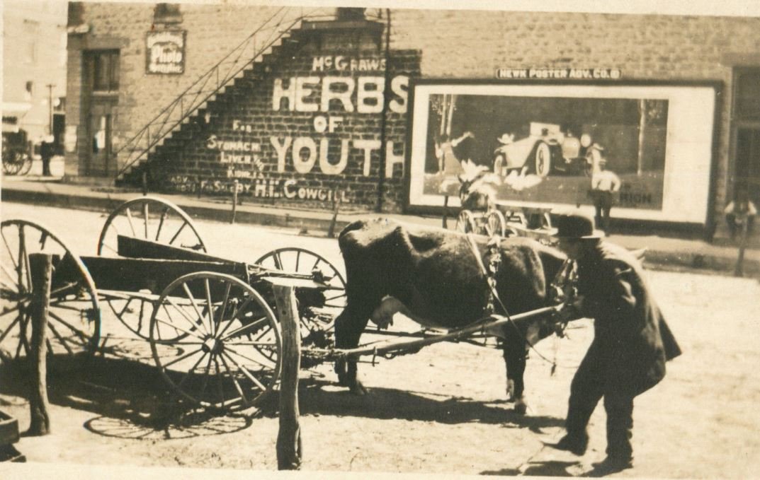 That may be the place the peckers hung out? It looks like a quiet street. That poor old buckboard and cow have seen better days