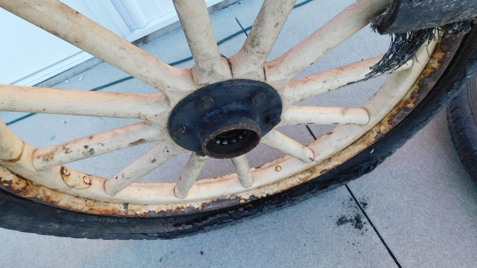 FS 5 early Model T Ford wheels, hubs and drums. 2 rear, 3 front. the tan ones came off the same car but one is a different make. the wood is solid. I will not ship. Sold as is. $350. Look closely at the pictures. Located in S. Mn. 507 458 6778, NO TEXTING.