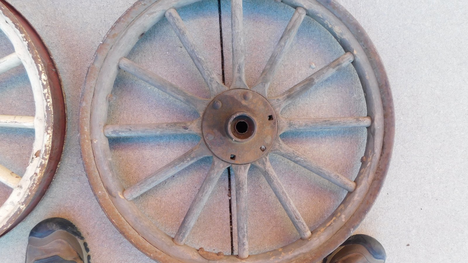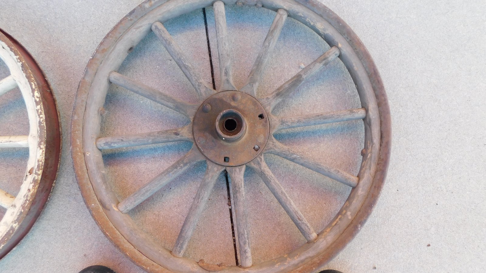 FS 5 early Model T Ford wheels, hubs and drums. 2 rear, 3 front. the tan ones came off the same car but one is a different make. the wood is solid. I will not ship. Sold as is. $350. Look closely at the pictures. Located in S. Mn. 507 458 6778, NO TEXTING.