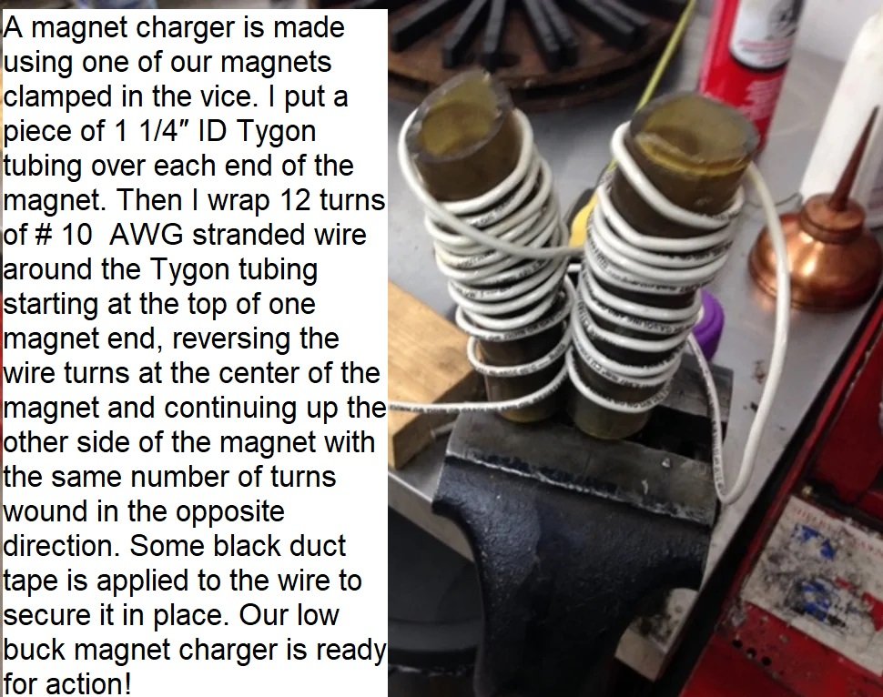 I charged my magnets using number 12 house wiring and a car battery. The individual insulated strands were stripped out of the Romes covering. 21 turns on each side of the coil. One side of the magnet has black wire, the other side has white wire in order to keep track of polatity. Used a 12 volt car battery to give it a quick flash. I tried 18 volts and all it did was melt the end of the wire and it didn't improve the strength of the magnet strength. The results have been very good. The engine starts easily on magneto when hand cranking.
