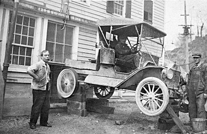 An early lift with what looks like a Commercial Roadster on it, 1912(?) just like mine! I might have to rig something up like this so I don't have to crawl under my Model T. Looks safe to me!