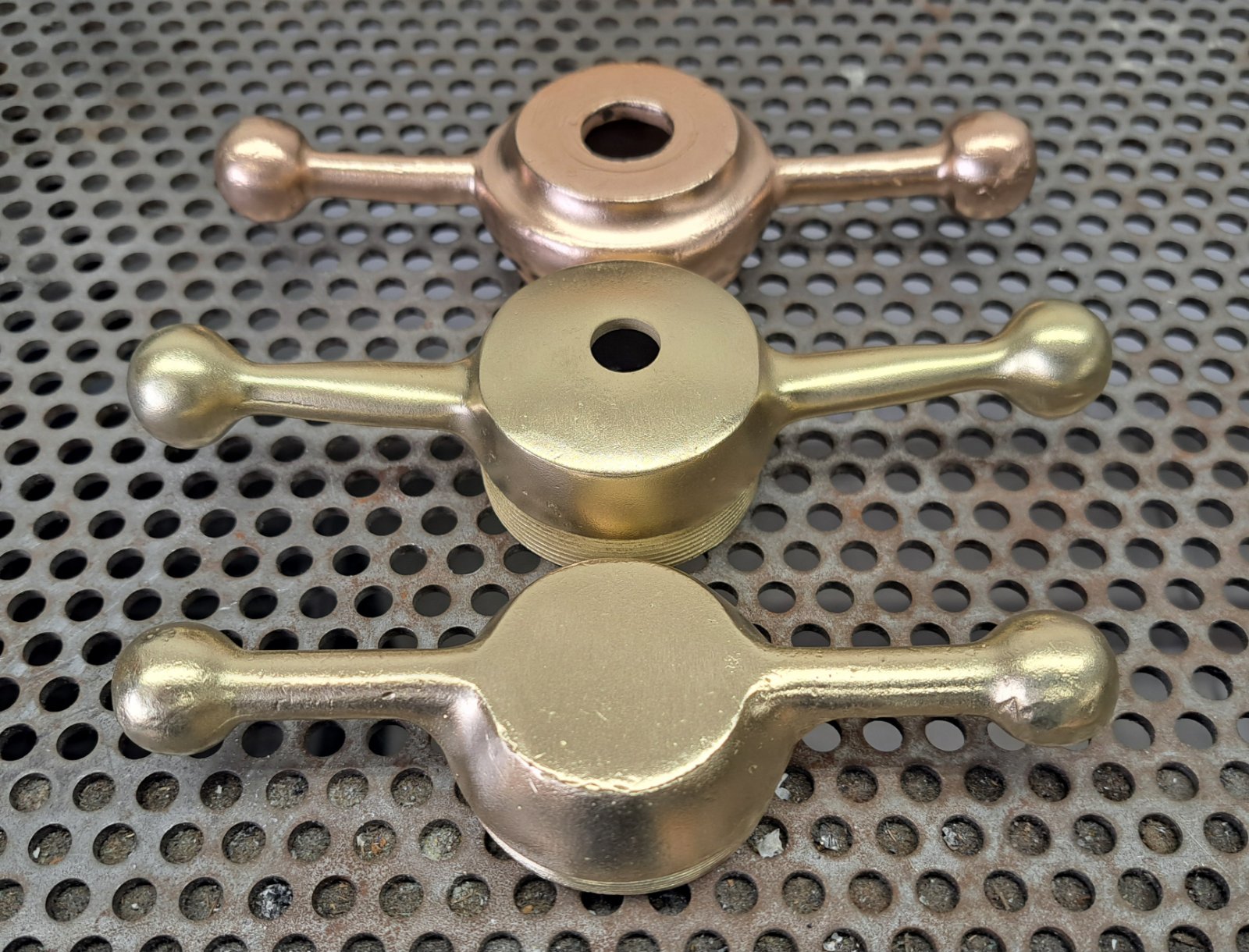 Three brass dog bone style radiator caps sold as one lot. Price is $35.00 plus $8.50 domestic shipping. Mark Chaffin (951) 805-0928 [*]SOLD
