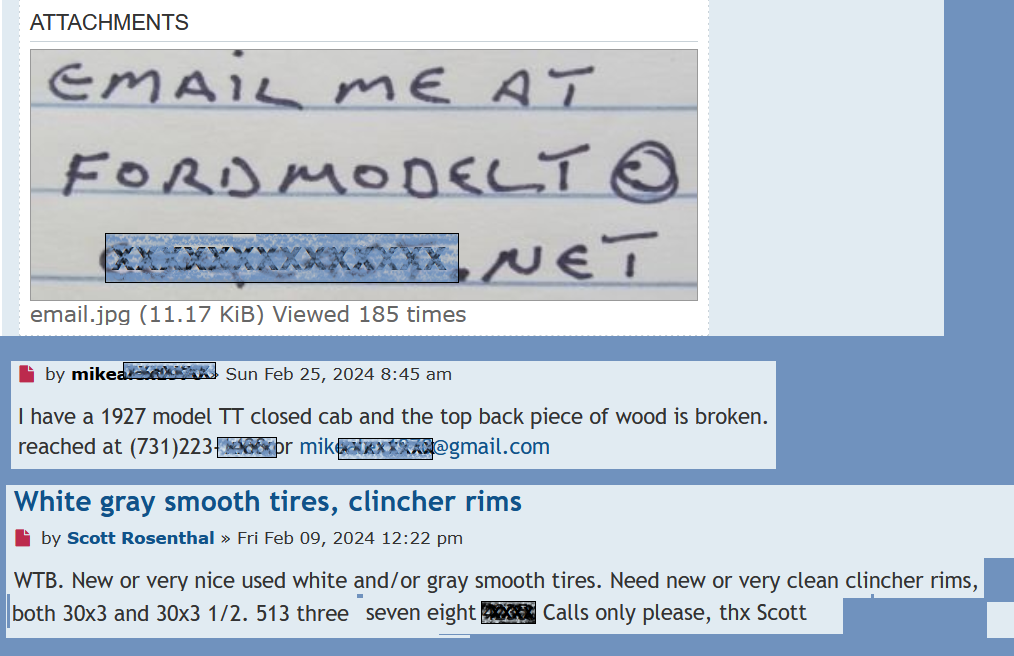 Just about every WTB ad I place on any site generates scam responses. Usually they start with " Contact so and so at blah blah auto parts he has what you want". Then they provide pictures that when I do a Google search on are from other sellers on the internet. It just happened last week when I posted wanting to buy some Model A running board aprons. When I told the guy they were pictures off of the net and he was a scammer he sent more pictures of splash aprons he "had". Some pictures had snow on the ground and some had palm trees in the background. The second batch was from a completed Ebay listing. Art