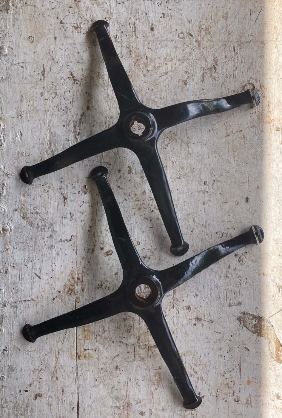 Sandblasted and powdercoated glossy black. All 4 ‘arms’ rest evenly on flat surface. Top steering wheel spider has 2 internal keyways opposite each other. Only $75 each + USPS small flat rate box for either or both. 12.5”+- center to center opposite ‘arms’