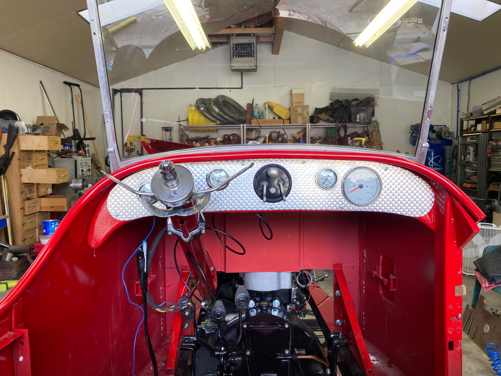 I have a lot to do to make the Santa Clara endurance run next month. Part of the problem is getting things done in the right order. Believe it or not the first thing was getting the dash panel made. It has to go on before the steering column, which has to go on before the skirts which have to go on before the radiator. I was nervous about cutting out the panel and punching the gauge holes, they don’t give away that engine turned material. It looks crooked but that’s actually the edge of the cockpit.