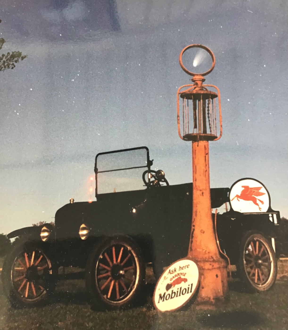 Attached is a photo taken in 1997 of my 1919 Roadster taken at a friends house. He was a gas pump and sign collector who wanted a picture on my Model T parked next to his gas pump with the missing globe. It’s of the comet Hale Bopp that was easily seen at dusk for a while in 1997.