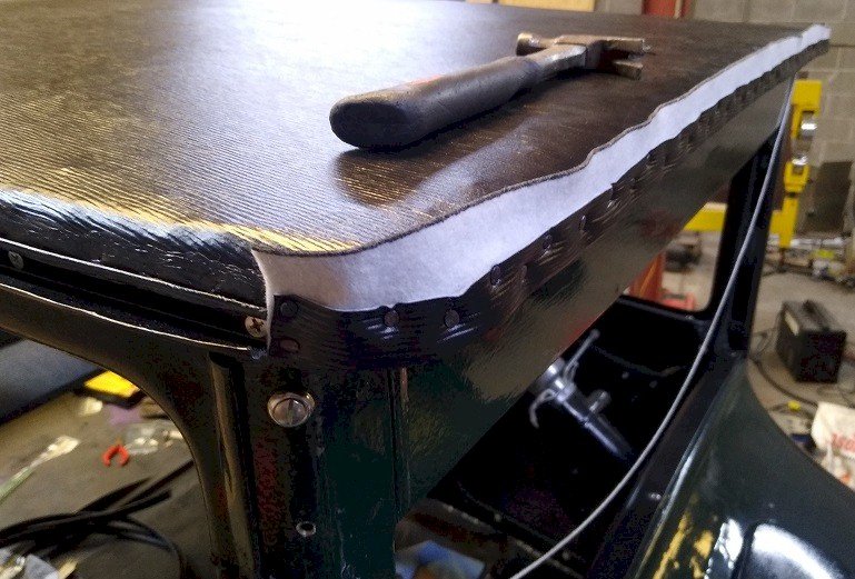 Pushed the T out into the hot sun, stretched the vinyl top, and tacked into place. Then screwed the two drip rails which I made from stainless steel with stainless Philips drive screws (which I will hide in the near future). My top kit came with what I believe to be Hidem welting. I did not like the rounded ball appearance so used some scrap cobra grain and folded my own welting for the front and rear. There is a bead of silicone over the tacks before the top flap gets folded down. I suppose this is one of the many wrong ways to do it. Also, this kit's instructions said to use chicken wire. To the dislike of many here, I followed the instructions.