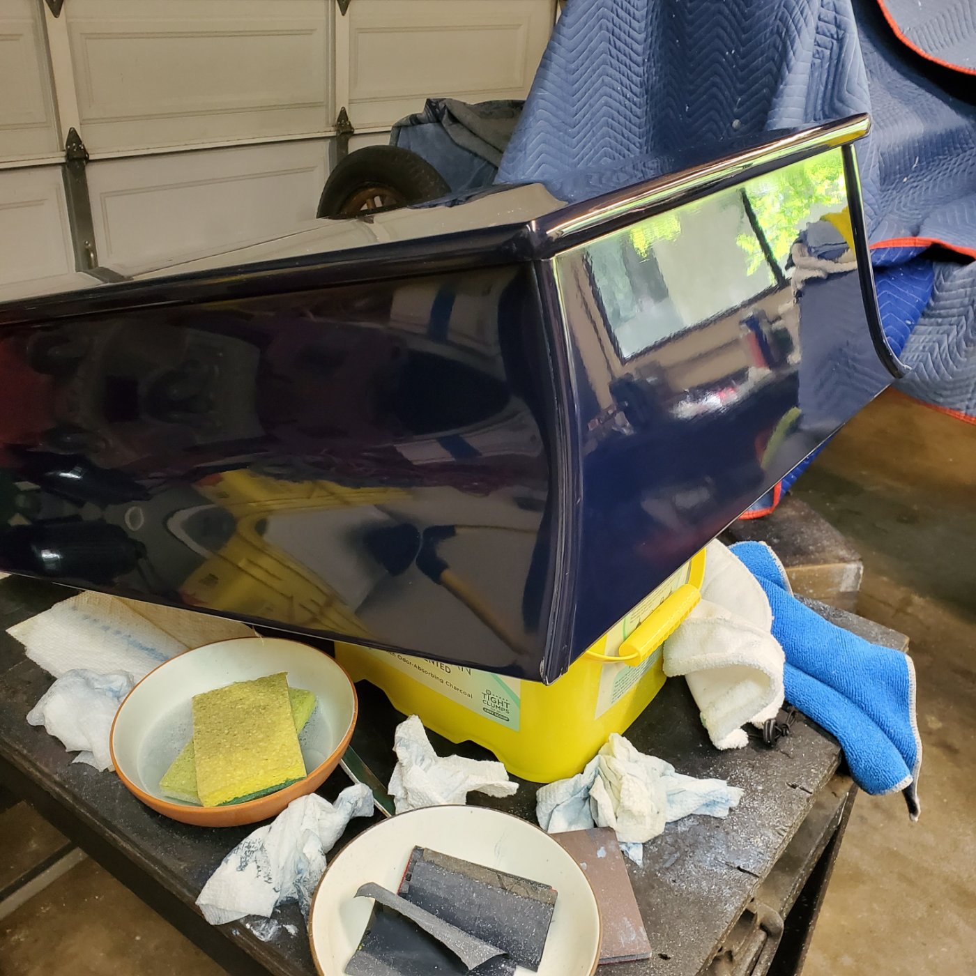 Get an old table or saw horses with a piece of plywood to sit it on. After cleaning and preparing for painting, turn the fender over and prime the underside first. After the primer dries, apply several coats, allowing each coat to dry thoroughly, sanding lightly between coats using 400, then 600 wet dry sandpaper. When done, mask the newly painted underside with newspaper and masking tape to protect from overspray.