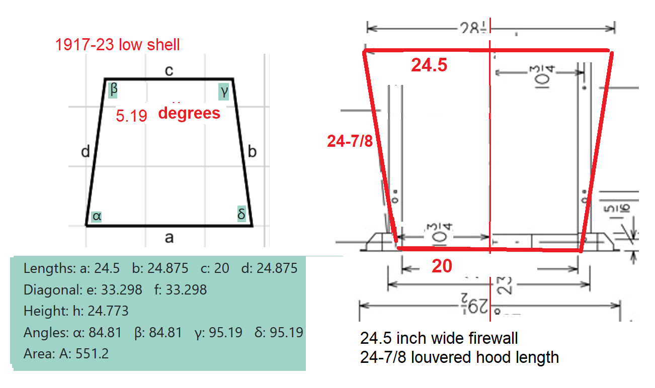 John, I don't know the reason of the change from rectangular to round lacing holes. I don't know that anyone alive, today, does with authority, but I have had 23-25 steel shells with the rectangular and 26-27 steel and brass shells with the round holes, but no rectangular in 26-27, which verifies what Steve said. Also, Thank you, Frank, for posting the dimension diagrams of the different hoods. As they show there was only 1/8" difference on the top hood panel on each side (total for both sides of 1/4") compared to a 26-27 hood and they show a 1 1/2" difference (per side; total of 3" difference) in the hood width at the firewall, it is obvious that the shell sides on 26-27 shells must have a greater flare than the sides of a 23-25 shell. I do not currently have a 23-25 shell to observe, but my previous observation is that compared to a 26-27 shell, the sides on a 23-25 shell have no OR ALMOST no flare to them. If they have any flare, it is minuscule compaired to 26-27 shells.John kuehn wrote: ↑Sat Jul 06, 2024 3:08 pmMaybe a different company making them or a design change for what reason??